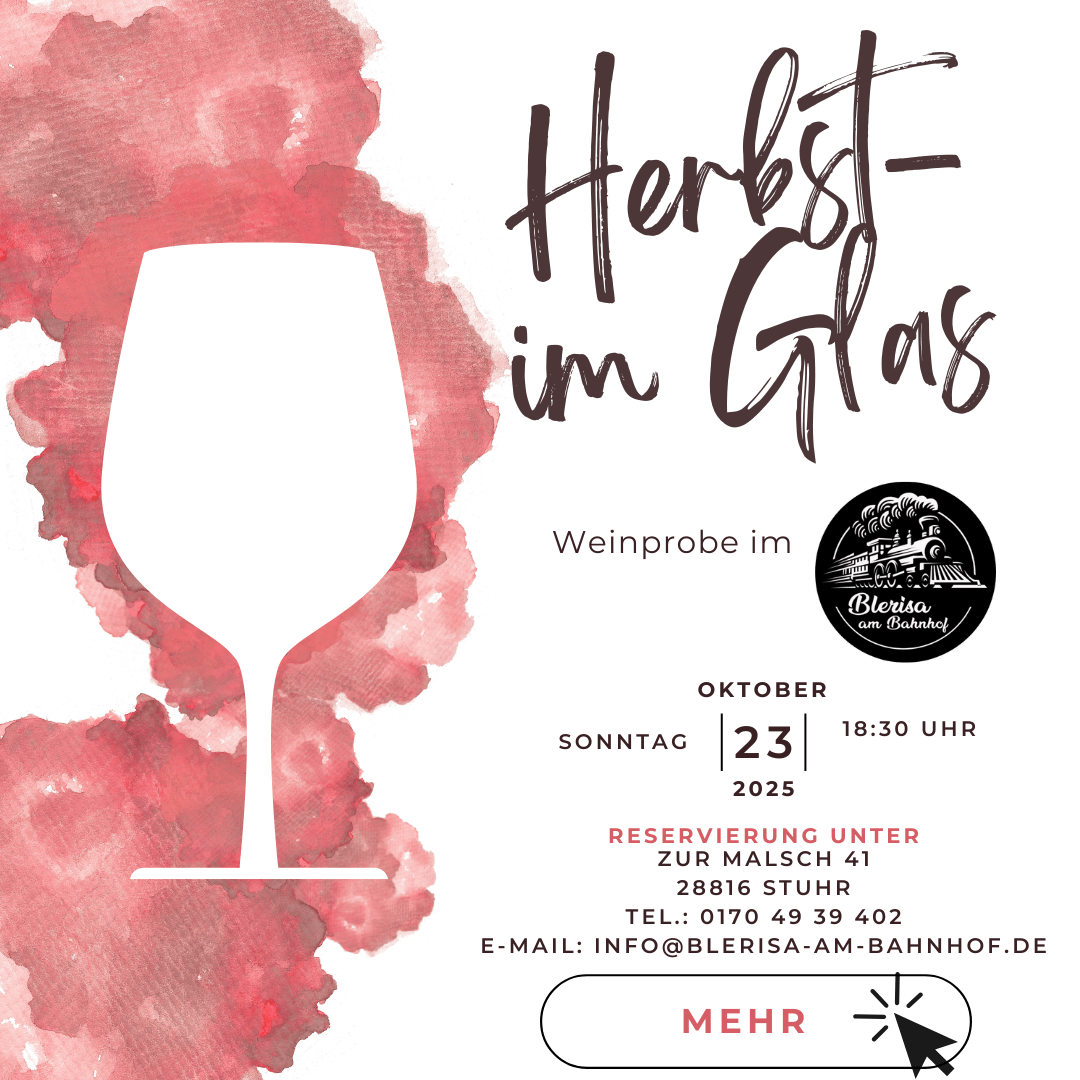 Wenn die Tage kürzer werden und draußen die Blätter tanzen, gibt es kaum etwas Schöneres, als den Abend mit einem guten Glas Wein zu verbringen. Unter dem Motto „Herbst im Glas“ laden wir Sie herzlich zu einer stimmungsvollen Weinprobe bei uns im Blerisa am Bahnhof ein.